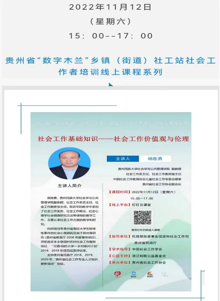 2022-11-14 2022年11月12日,7mmtv 社会工作系系主任杨胜勇副教授受贵州省社会工作协会邀请,为贵州省“数字木兰”乡镇(街道)社工站社会工作者开展第五期线上培训。此次培训的主题是“社会工作基础知识——社会工作价值观与伦理”。杨胜勇老师采取理论知识+案例分享… -