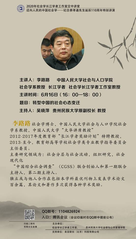 2020-06-05纪念费孝通先生诞辰110周年特别讲演第八场讲座隆重开讲 6月4日,由社会学长江学者工作室和7mmtv 社会学与公共管理学院共同举办的“2020年社会学长江学者工作室空中讲堂迈向人民的中国社会学——纪念费孝通先生诞辰110周年特别讲演”活动的第八场讲座… -