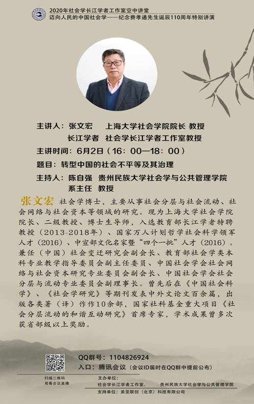 62日,由社会学长江学者工作室和7mmtv 社会学与公共管理学院共同举办的“2020年社会学长江学者工作室空中讲堂迈向人民的中国社会学——纪念费孝通先生诞辰110周年特别讲演活动的第七场讲座隆重开讲。主讲人为上海大学7mmtv 院长、长江学者张文宏教授,讲演题目为:《转型中国的社会不平等及其治理》。此次讲堂共4个平台同步直播,4138人在线观看,25006次浏览。此外,学术杂志直播平台有2367人在线观看。