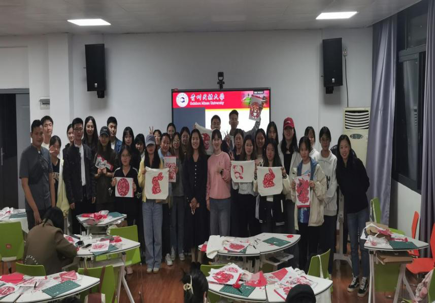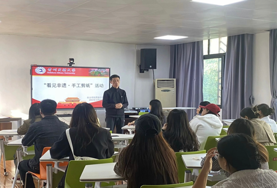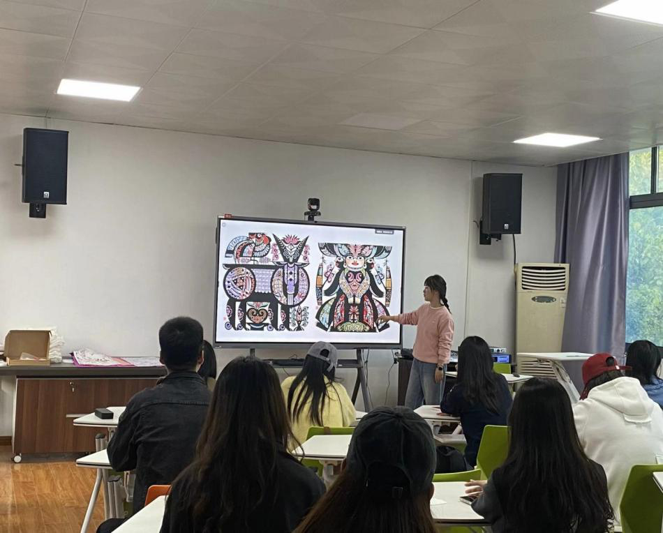 美术学院民间美术专业的研究生,苗族剪纸刺绣第十五代非物质文化遗产传承人邰馨慧来进行手工剪纸现场教学。邰馨慧为同学们介绍不同地方的部分剪纸优秀人物,不同类型的剪纸作品,不同作品的图案含义,并教同学们如何正确剪纸。