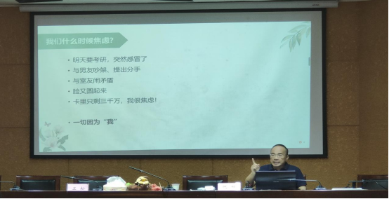 首先,阮极老师以现场游戏、播放视频的方式帮助同学们初步了解焦虑的原因。指出人们焦虑的来源是因为自己,即“一切因为‘我’”,并将“我”的涵义分解为“自我中心”、“完美主义”、“竞争压力”三个方面,揭示了压力与焦虑产生的关联和原由。