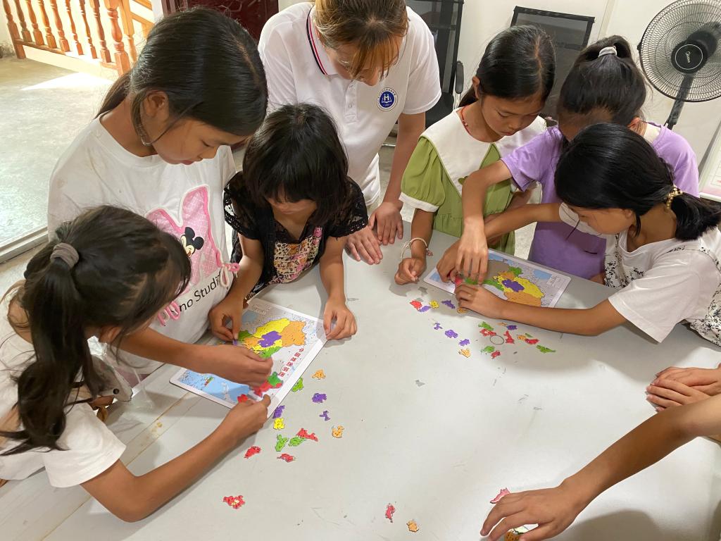 7月16日,宣讲队带领村里儿童开展了别开生面的民族团结趣味活动。通过拼中国地图、画石榴籽等趣味互动,让孩子们在欢乐中理解"国家统一、民族团结"的深刻内涵。当孩子们完成中国地图拼图时,现场响起阵阵欢呼;在绘画环节,队员们生动讲解"各民族要像石榴籽一样紧紧抱在一起"的民族团结理念,以润物无声的方式引导孩子们从小铸牢中华民族共同体意识。