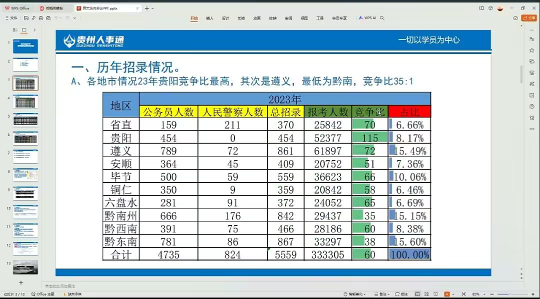 首先,商老师对历年贵州省公务员考试的招录情况进行了详细介绍,并根据往年贵州省公务员考试招录比例的变化情况,从有利和不利因素两方面加以分析,使同学们对当前的就业形势有了一个清醒的认识,同时强调在选岗时需要充分考虑自身条件和竞争力,避免盲目选择热门岗位导致落榜。