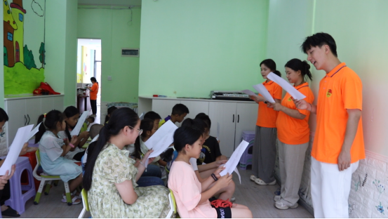 7月19日下午,《我和我的祖国》这首歌在秀眉社区“儿童之家”响起。宣讲队成员在活动中对《我和我的祖国》的歌词内容,以及歌曲背景进行了介绍,并向社区小朋友们开展了歌曲教学,并开展推普志愿服务。同时,为让社区居民更好地体悟中华民族一家亲的深刻含义,宣讲队邀请了曾在村BA深山音乐会献唱的台江县城关一小合唱团成员吴林芷向社区小朋友们教授了苗语版本的《我和我的祖国》。