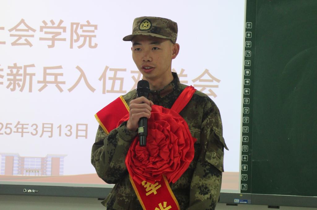 随后,2022级社会工作专业的陈科宇同学作为学生代表发言。他向即将入伍的田儒坤同学表达了祝贺与敬意,结合自身军人家庭的经历以及个人的从军梦想,讲述了对入伍学长的钦佩之情,畅谈了对军人奉献精神及其意义的深刻理解。陈科宇同学衷心祝贺田儒坤学长能够在军旅之路上书写精彩篇章,为国防事业添砖加瓦。紧接着,2023级与2024级的学生代表也为即将投身军营的田儒坤同学送上了真挚祝福。