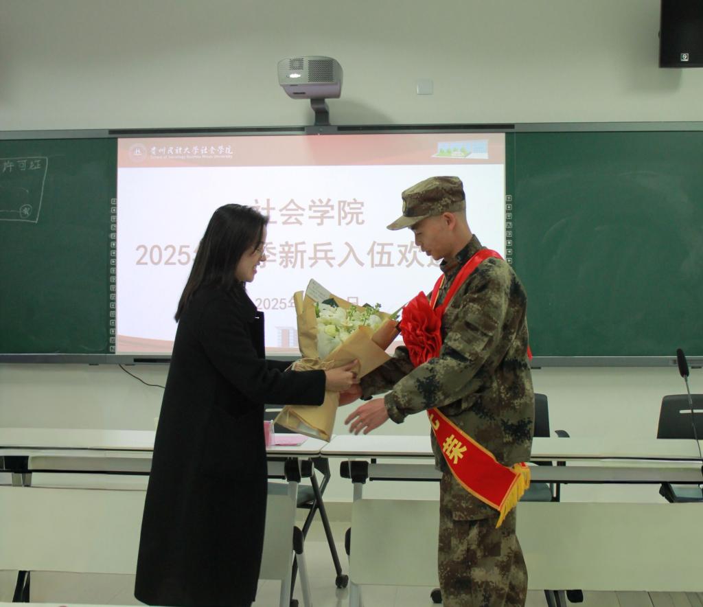互动环节结束后,学院党委书记李黎亲切地为田儒坤同学颁发纪念品,这份礼物承载着学院对他满满的关怀与鼓励。随后,班主任王素霞老师手捧寓意深刻、饱含期望的入伍花束,郑重地送给即将踏入军营的田儒坤同学。