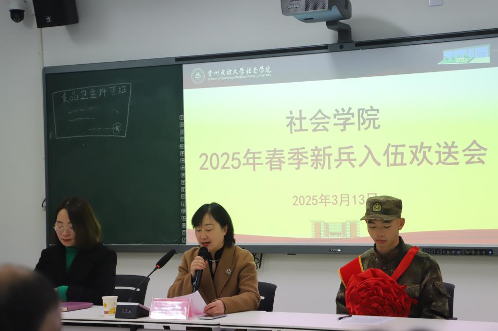 A206室举行了2025年春季新兵入伍欢送会。此次会议由学院党委副书记裴凡苗主持,学院党委书记李黎、院长包智明、副院长卫松、副院长王晓晖出席了会议。毕业班班主任老师及各年级学生代表参加了此次欢送会。