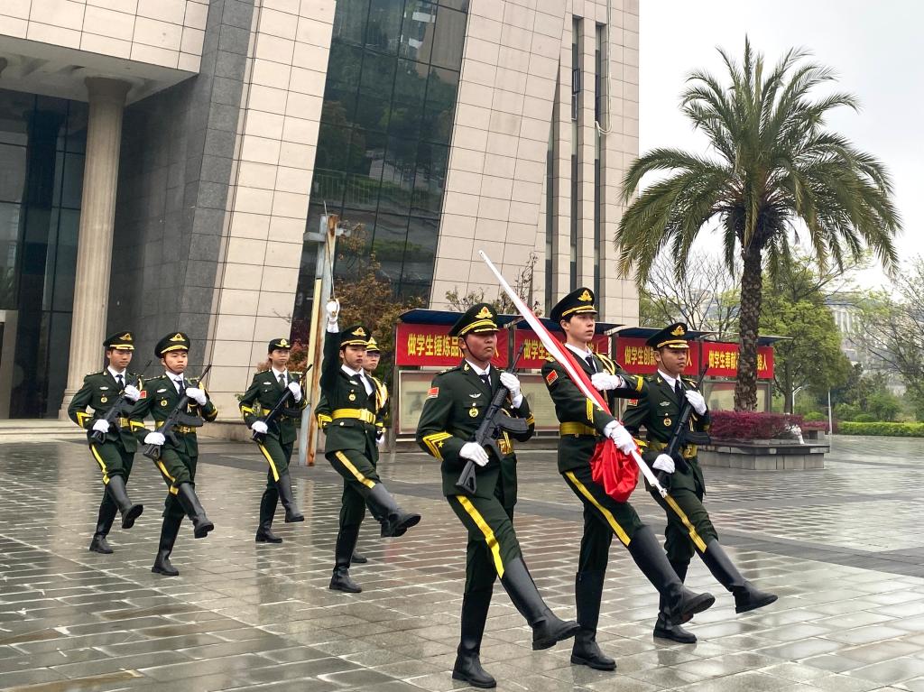 上午7点30分,升旗仪式正式开始,校国旗护卫队迈着铿锵整齐的步伐护送五星红旗入场。在激昂的《义勇军进行曲》中,鲜艳的五星红旗迎着旭日冉冉升起,全体师生面向国旗行注目礼,齐声高唱国歌。