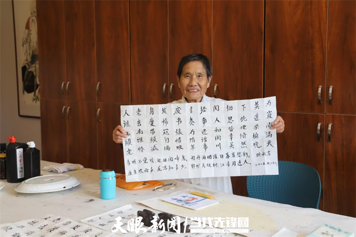 走进书法室,墨香氤氲,一位老人手握毛笔,笔尖在宣纸上缓缓游走。这是欧秋芳老人又在练字了。“我今年88岁了,书法室是我每天必来的,练练字很开心。在这里生活作息都很规律,既安心又舒心。”聊天中欧秋芳展示着她的书法作品。