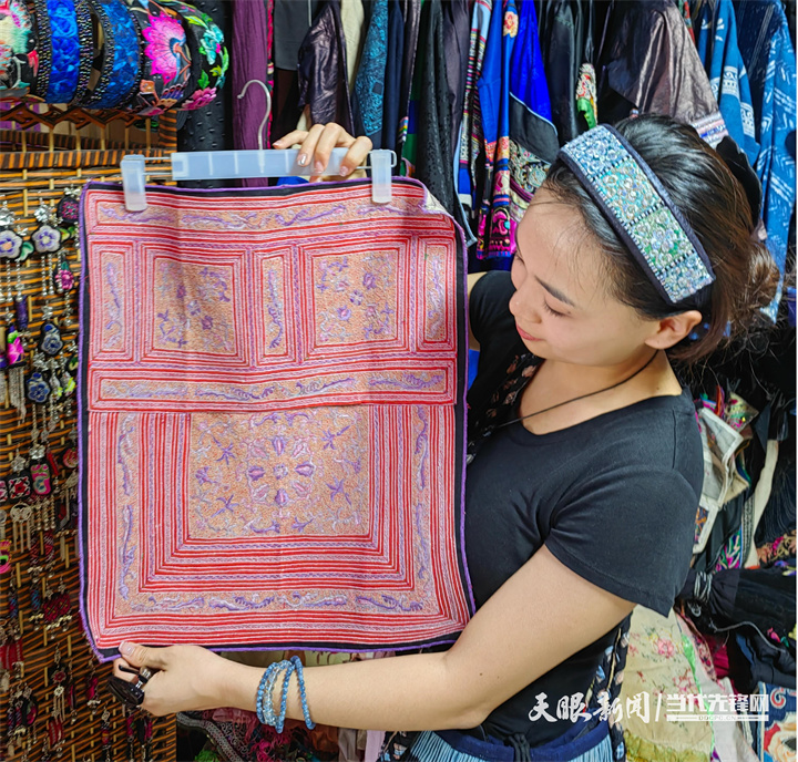 个摆满苗绣的摊位前,一对年轻的夫妇拿起绣品翻看:“嬢孃,您这网上有店吗?”