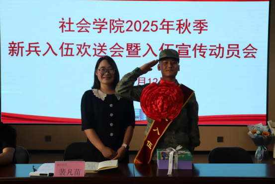 欢送会在庄重而温馨的氛围中拉开帷幕。首先,裴凡苗副书记为入伍新兵颁发纪念品,小小的纪念品承载着学院对新兵的牵挂与期许。同时,裴凡苗副书记对入伍新兵提出殷切期望,望他珍惜军旅时光,在部队磨意志、长才干、壮筋骨,勇于面对挑战,为我国国防事业贡献力量。