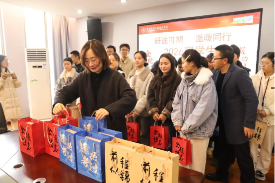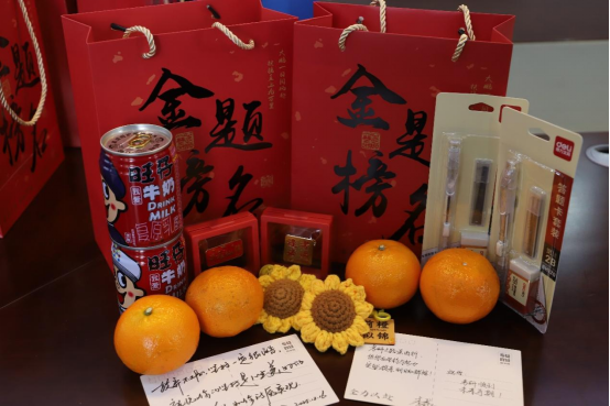 随后,学院精心准备的“考研大礼包”逐一送至学子手中。礼盒套装镌刻着“金榜题名、前程似锦、逢考必过”等美好寄语,礼包内含备考文具、“大吉大利”的橘子、“一举夺魁”的钩织向日葵、“越来越旺”的旺仔牛奶、祝福胸针等实用物资,还有学院师生精心手写的祝福笺。每一件礼物都承载着学院对学子们的暖心关怀与美好祝愿。同学们纷纷表示,定会带着这份温暖与期许,全力以赴迎战研考,不负学院期望。