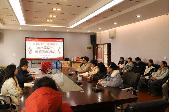 于D406会议室开展“研途可期,温暖同行”考研慰问活动。学院党委副书记裴凡苗、副院长卫松、团委副书记王素霞与2026届考研学子齐聚一堂,以温情为盾,共赴一场关于梦想与坚持的暖心之约。